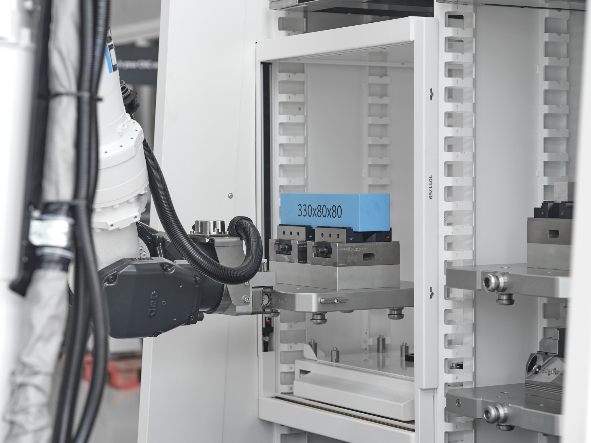 Während bei den Roboterzellen der Platinum und Titanium Baureihe die Anzahl zu bearbeitenden Werkstücke durch die Anzahl der Schubladen limitiert ist, können die Roboterzellen der Infinity Baureihe eine nahezu unbegrenzte Anzahl an Werkstücken und Paletten aufnehmen. Ermöglicht wird dies durch flexibel einteilbare Regale und eine integrierte Höhenkontrolle zur optimalen Ausnutzung der Regalkapazität. Die Speicherung der Werkstücke erfolgt auf Raster-Trays. Um sehr flexibel auch auf kleine Losgrößen, schwere Teile oder komplexe Spannsituationen reagieren zu können, verfügt die Infinity Lösung über Palettenplätze zum Vorhalten unterschiedlichster Spannvorrichtungen. Als echte Multi-Batch Automation setzt der Roboter zunächst die benötigte Spannvorrichtung automatisch in die Maschine ein und bestückt dann die Vorrichtung aus den Trays mit den Rohteilen.