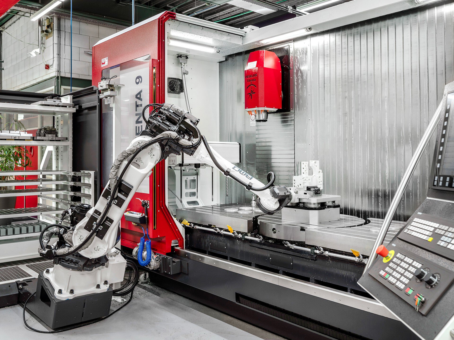 I centri di lavoro della Serie TILTENTA sono utilizzati principalmente nella produzione in piccole serie e di pezzi singoli, grazie all'elevata Altezza della lavorazione combinata a 5 assi e di pezzi lunghi. Con l'automazione aggiuntiva, i Clienti mirano a sfruttare la Macchina e lo spazio con la massima produttività, ad esempio attraverso il Gestore automatico in un turno supplementare o nei fine settimana. A titolo di esempio, vi mostriamo come un centro di lavorazione TILTENTA 9 con una Corsa di Spostamento di 2600 mm sia stato equipaggiato con un sistema robotico BMO Platinum con una combinazione di caricamento di Pallet e pezzi. La Macchina è stata equipaggiata da HEDELIUS con un Trasferimento di rotazione e una Pneumatica per il controllo del sistema di bloccaggio a punto zero, un Automatismo porta e un'interfaccia robot. L'automazione è stata eseguita direttamente dal nostro partner di automazione.