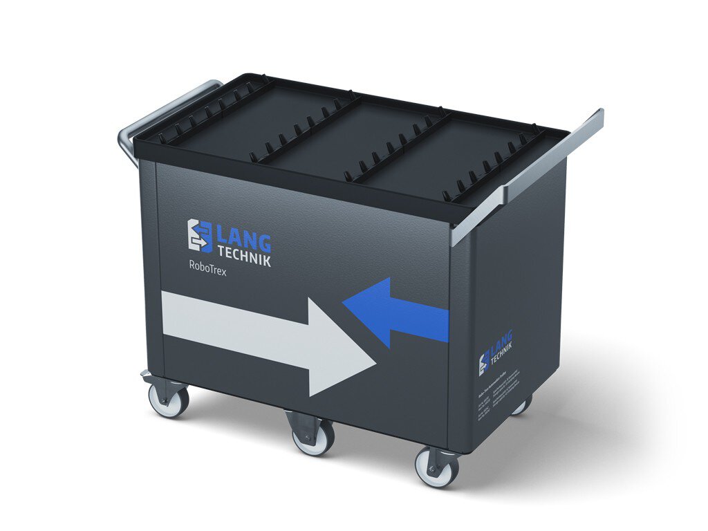 Die Automationswagen dienen als mobile Werkstückspeicher. Die patentierte, hochkantige Lagerung der Schraubstöcke sorgt für eine optimierte Ausnutzung der Stellfläche. Die Automationswagen erlauben ein Auf- und Abspannen von Werkstücken auch in großer räumlicher Entfernung von der Maschine. Während des Betriebs der Maschine kann ein Automationswagen entnommen oder getauscht werden. Die ROBOTREX 96 verfügt zudem über einen Greiferwechsel, der das Abarbeiten unterschiedlicher Schraubstockgrößen ermöglicht. In Verbindung mit der automatischen Erkennung der Automationswagen bietet die Anlage eine hohe Flexibilität und deckt eine große Teilevielfalt ab.