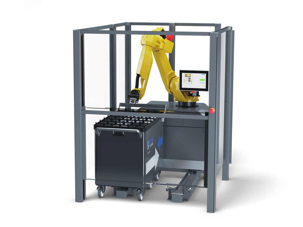 Pünktlich zur Hausausstellung liefert die Lang Technik GmbH aus Holzmaden ihre Automationslösung ROBOTREX 96 in Meppen an. Die Automationszelle besteht aus einem FANUC 6-Achs-Roboter mit 50 kg Traglast sowie zwei Automationswagen, bestückt mit insgesamt 46 Schraubstöcken.