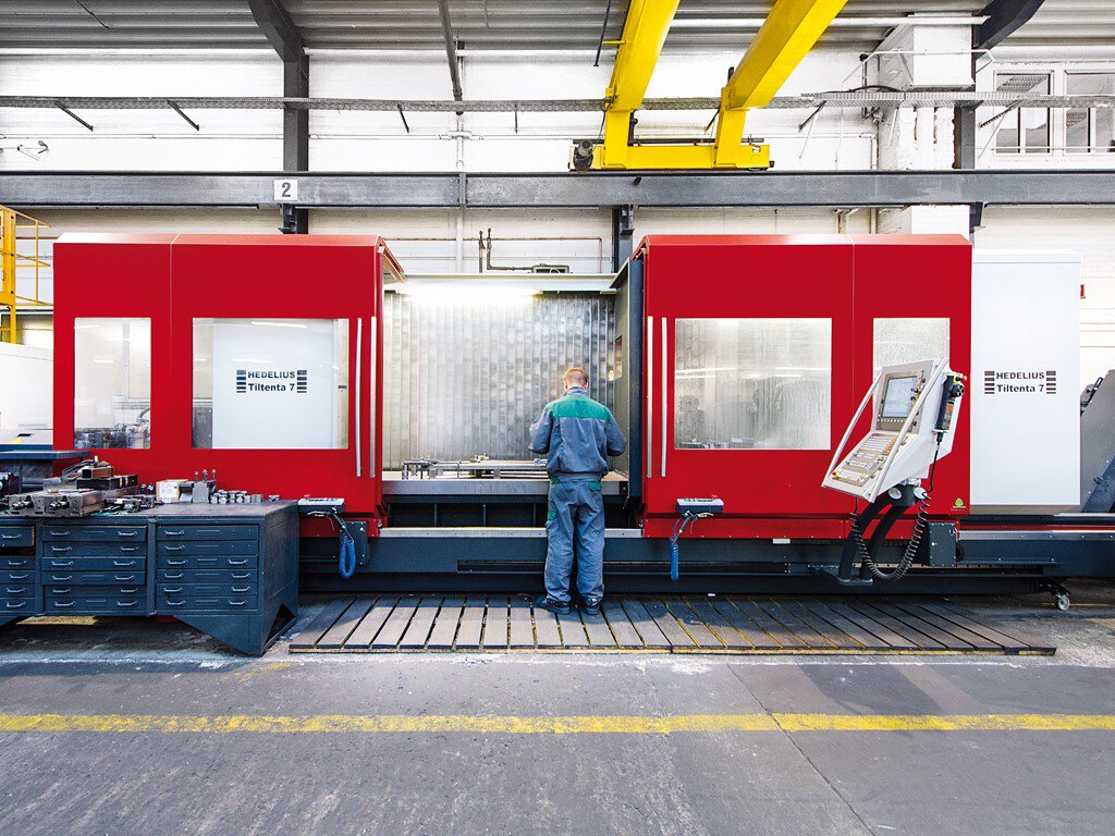 Für die ganz unterschiedlichen Aufgaben arbeitet Wendt Maschinenbau mit verschiedenen Bearbeitungszentren von HEDELIUS, in der Regel im Pendelbetrieb. Die RS 505 K18 aus der RotaSwing-Baureihe kombiniert einen Dreh-Schwenktisch für die 5-Achs- und einen feststehenden Maschinentisch für die 3-Achs-Bearbeitung in einem Arbeitsraum. Konzipiert als universelle Fertigungsinsel ist sie optimal für eine sehr flexible Produktion. So steht noch eine weitere RotaSwing in der Produktion, neben einer HEDELIUS BC 100 mit 2500 mm X-Verfahrweg für die 3-Achs-Schwerzerspanung. Die BC-Baureihe überzeugt mit hoher Leistung in der Schwerzerspanung, denn die Hauptspindel erreicht bis zu 10.000 Umdrehungen pro Minute mit 55 kW Antriebsleistung.  Hier werden Sonderteile für die Stanzniettechnik in der Automobilindustrie gefräst. Weiter bearbeitet werden die Teile im Pendelbetrieb auf der TILTENTA 7 mit 4200 mm X-Verfahrweg, einem Schwenkspindel-Bearbeitungszentrum für die 5-Achs-Simultanbearbeitung.