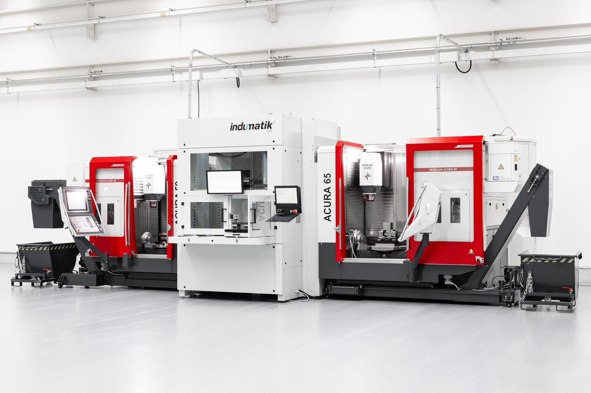 De koppeling van een ACURA 50 EL en een ACURA 65 EL via het Indumatik Light 120 pallet-handlingsysteem is nu klaar voor demonstratie. De Indumatik Light 120 laadt de Bewerkingscentra met 5 assen met pallets van 400 x 400 en 200 x 200 mm. Het demonstratiesysteem Reservoirs in totaal 33 pallets (12 pallets van 400 x 400 mm en 21 pallets van 200 x 200 mm). Andere Palletafmetingen zijn natuurlijk mogelijk. Beide bewerkingscentra zijn uitgerust met een HSK A63 spindel met 18.000 tpm en een STANDBY MAGAZIJN. In totaal zijn er 480 gereedschapsposities beschikbaar op beide machines (235 gereedschapsposities op de ACURA 50 en 245 gereedschapsposities op de ACURA 65).